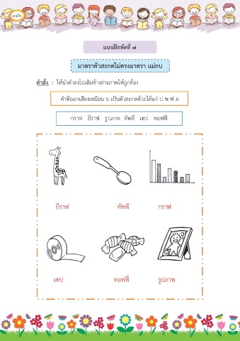 ๑๔๒ แบบฝกหดท ๗ ั ึ ่ ี มาตราตวสะกดไมตรงมาตรา แมกบ ่ ่ ั ่ ้ ู ้ คำสง : ใหนำคำลงไปเตมขางลางภาพใหถกตอง ิ ้ ้ ั ่ คำทออกเสยงเหมอน บ เปนตวสะกดดวยไดแก ป พ ฟ ภ ่ ้ ้ ่ ี ็ ื ั ี ู ี กราฟ ยราฟ รปภาพ ทพพ เทป ทอฟฟ ่ ี ี ั